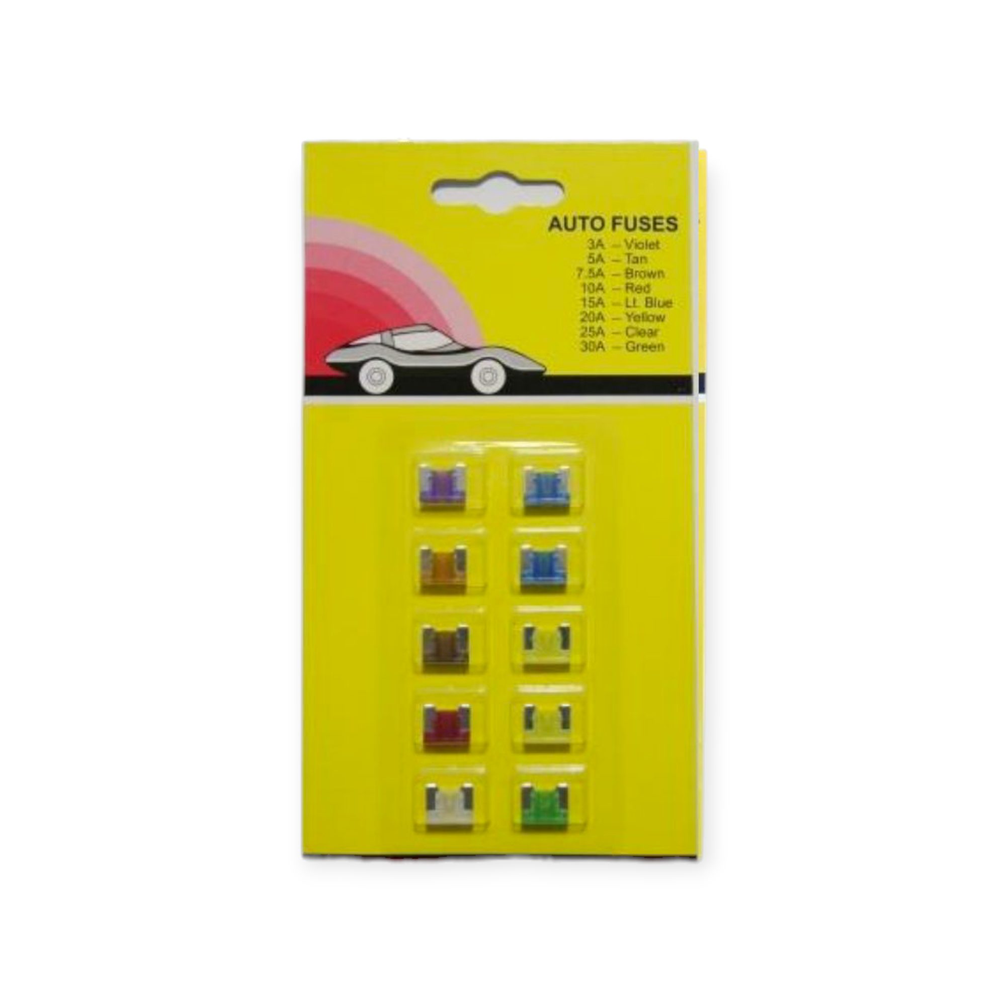 סט קומפקטי של 10 פיוזים מיני במידות שונות (3A–30A), מתאים לרוב סוגי הרכבים.