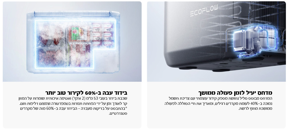 EcoFlow GLACIER Classic שומר על טמפרטורה של 4°C למשך עד 43 שעות בדגם 35L, ועד 39 שעות בדגמי 45L ו-55L** – אידיאלי לשטח, לקמפינג או כהקפאה מגובה בזמן הפסקת חשמל.