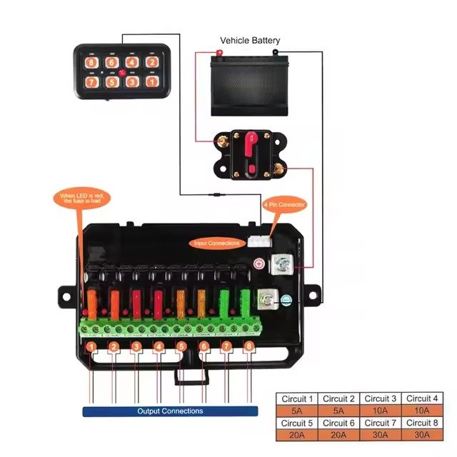 פנל מתגים אלקטרוני מתקדם עם 8 יציאות נפרדות לשליטה מלאה על כל מערכות החשמל ברכב שטח, סירה, קרוואן או רכב עבודה.