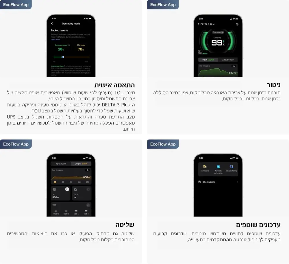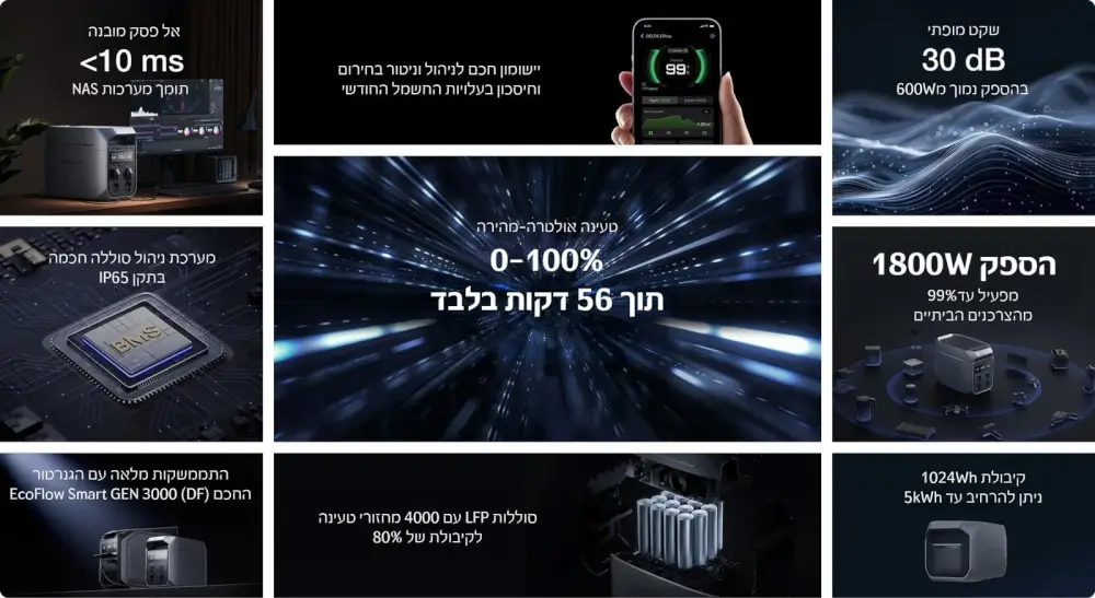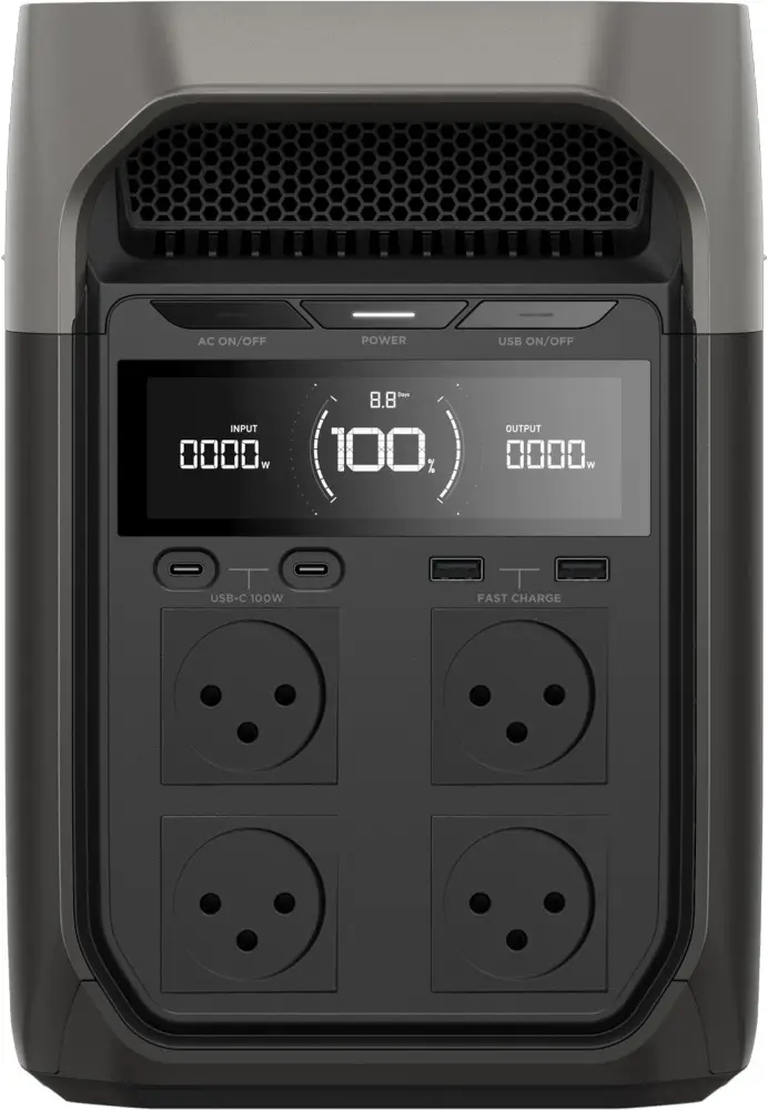מדובר בדור החדש של תחנות הכוח של EcoFlow – עם סוללת LiFePO₄ בטיחותית ועמידה, הספק עבודה גבוה, טעינה מהירה במיוחד, ותמיכה בהרחבת קיבולת. התחנה מצוידת בעשרות יציאות שונות ומאפשרת לחבר מכשירים חשמליים במקביל – מטלפונים ניידים, דרך מקרר נייד ועד כלי עבודה חשמליים.